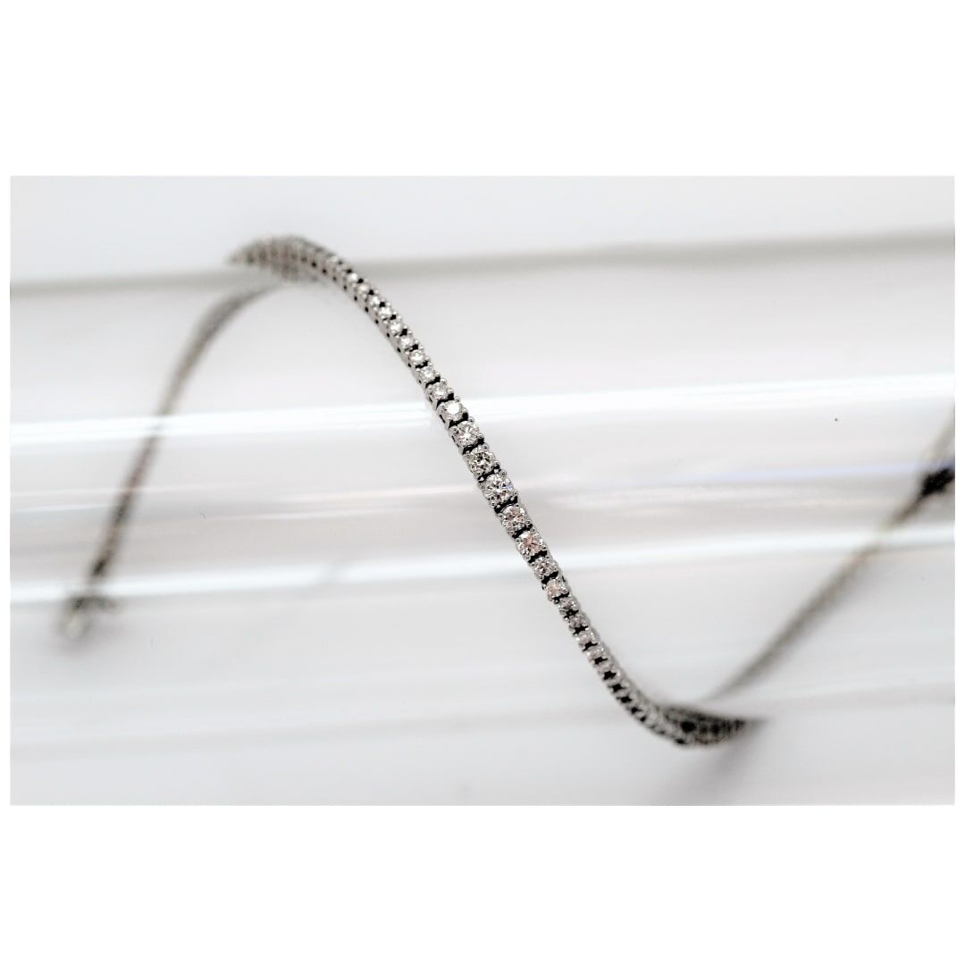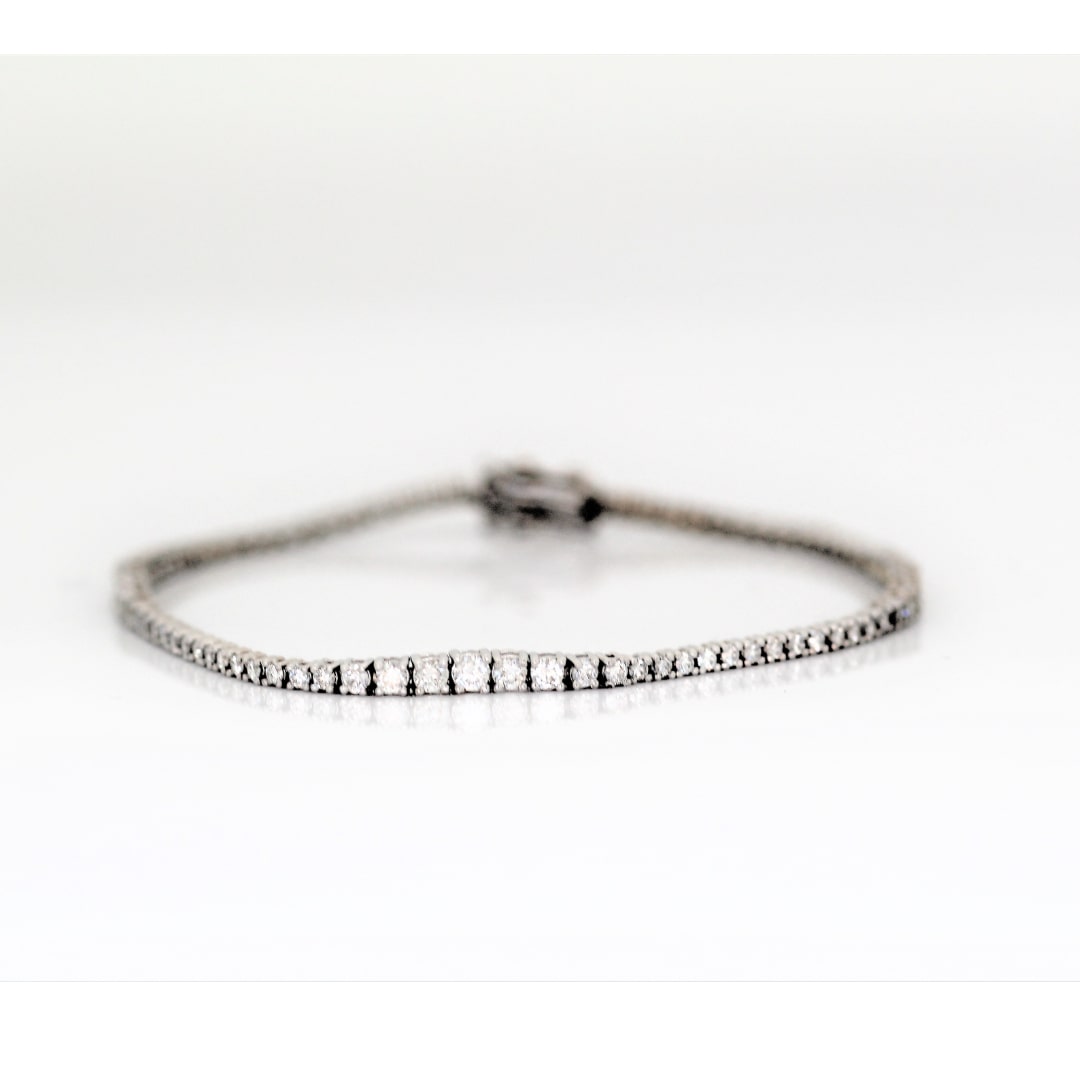 This fashion diamond 14kt white gold graduated diamond eternity bracelet with has 85 round brilliant cut diamonds equaling  2.03 carat total weight. This piece has graduated sizes of diamonds in sections that give a stunning look across the entire bracelet.